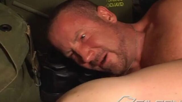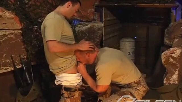 Back from maneuvers, Trojan Rock and Ivan Andros have a chance to cool off in their camou gear, but temptation leads them to heat things up. They gradually work their way out of their gear, stroking and sucking as they strip, and into a frenzy of man to man action. Trojan buries his cock in Ivan's ass, opening him up for a good hard fuck. Ivan takes it all eagerly and allows the rhythmic fucking to push him to the boiling point before both men stroke out their loads and discover the true meaning of R&R.