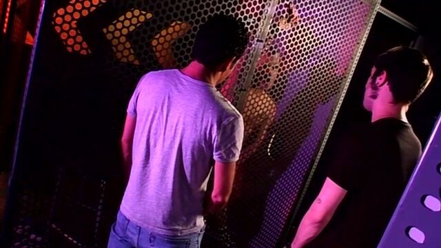The guys gather around as hard inches of uncut cock slide between lips and the live fuck show begins. Their cocks are drooling in their pants as they watch through the mesh, hard meat being licked and sucked, then easing up into that tight young ass for an amazing sweaty fuck that has them both spewing out so much cum!