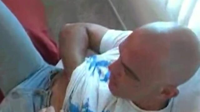 Jesus is grown man who hasn't quiet outgrown being a punk, or rather, a very confident, overly sexual and slightly dangerous looking stud packing a bulge in a packed basket that throbbed visibly across the room and a canvas of ink down his shoulder and arm that lets you know immediately there is as much on the surface of this hunk as there is inside. A shiny pate keeps the focus on those deep brown eyes that shout a piercing, 'come get it if you dare' as he rubs that hungry mound in jeans like the prize it is. When he finally peels down that denim, what does this bad boy have on, but camouflage print briefs, revealing a hidden playful side and he's just getting started. Smack into the center of view comes a very firm, perfectly round white ass - with 'smack' being the operative as the slap of the occasional spank he gives those cheeks echoes with an invitation we only wish we could have dropped the camera to accommodate - but then he rolls over and that thick, leaking cock with a black leather ring show he has needs of his own.He beats that meat as rough as he looks, spanking that pole against his abs then down against his ass before tweaking his nipples and firing off a load that seems to begins to simmer in his toes but reaches a full boil that makes his cock suddenly engorge to another inch. The look of his face, the tension in his whole body makes this not just a jack off session but a primal right as his finally fires off, reaching a plateau of visible ecstasy.