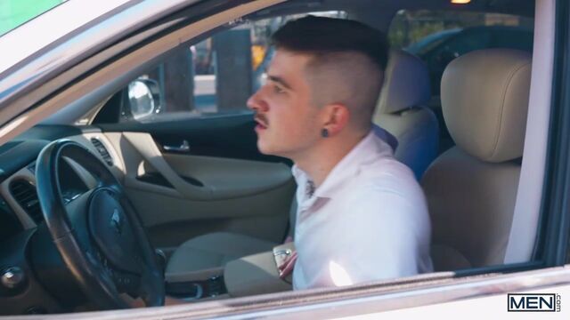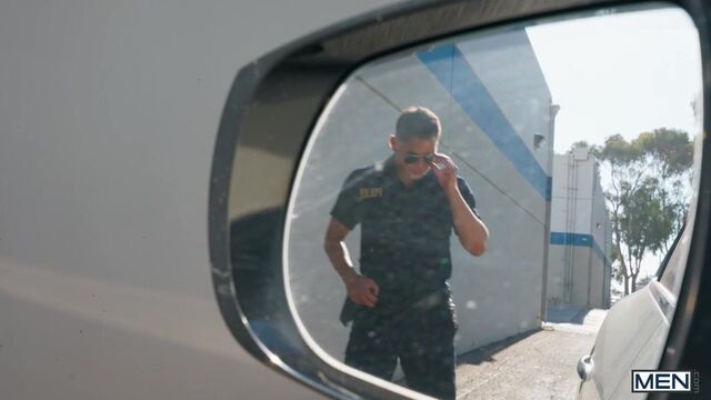 Harrison Todd gets so horny while driving, he just has to start stroking himself... but then he gets pulled over for driving erratically! When his glove compartment is full of dildos instead of his license and registration, officer Colton Reece brings him back to the station. Colton grills Harrison about his extensive rap sheet for indecent exposure, then tells the twink to try getting naked in the police station, which makes Harrison super hard. The dirty cop shows the law-flouting twink who's boss as he fucks him on his desk doggystyle and missionary, and he pulls out and cums on Harrison, then chokes the twink while the bottom jacks off and orgasms. But he shouldn't have left the scofflaw alone with his computer...