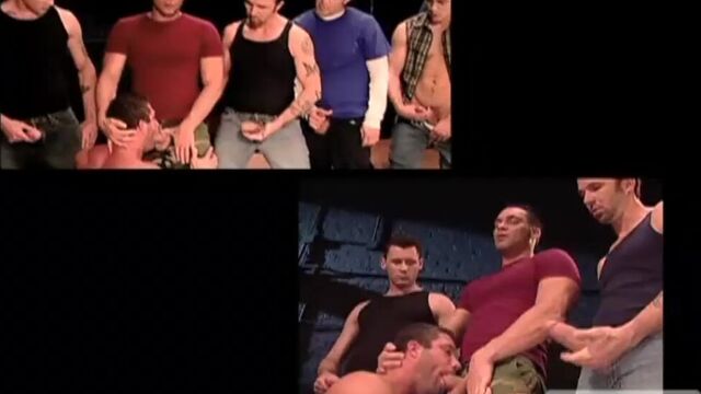 The group of horned up studs stand in a line, groping their own and each other's hardons through their jeans. Hungry bottom feeder C.J. Knight gets on his knees and moves down the line, giving attention to each huge cock, one at a time. With all five cocks wet and standing at attention the men remove their shirts and continue to face-fuck Knight. Enormous Chad Hunt and twisted Rod Barry compete to see who can make the hard-working Knight gag the most. 'Best Cock' Grabby Award Winner Barrett Long orders Knight to suck his huge balls and shoots a load all over the greedy pig-bottom. Next the men throw Knight onto a nearby bench and line up to fuck his face. Sexy blue-eyed Jude Collin stands over Knight's face and pummels him, followed by Hunt. Aussie top-stud Jed Willcox strips down and moves over Knight's face. Dominant sex fiends Barry and Jude Collin order two of the other men to suck their cocks while they wait their turn.