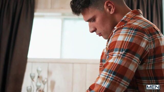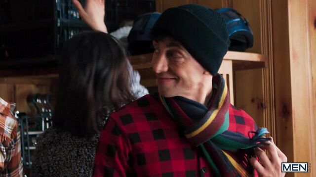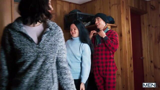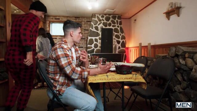 After a long day in the winter wilderness with their girlfriends, Liam Alyesto gets more than just warmed up as he watches Malik Delgaty take off his coat. Liam opens the butt flap in his onesie and flashes Malik his ass, and when they sit down for some fondue he shows the muscular hunk just what he has in mind on the big baguette, stroking it suggestively and sucking the end. While the women are in the kitchen, Liam gives Malik a hand job under the table, then slips off to the bedroom. Malik follows, finding Liam waiting on the bed on his hands and knees, ass out. Malik gives the bottom what he wants, penetrating that hole. Liam sucks Malik, then the guys fuck in spoon position before he rides the top. Liam cums as Malik drills him on his back before taking a delicious, drippy load on his face.