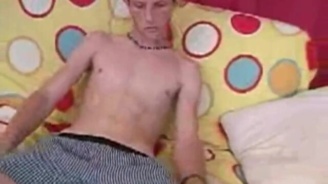 - Description: What's hanging off the thin body of this skater guy is definitely man sized and packed with the juice that would the whole varsity team proud. It's always the innocent looking skinny types that produce the biggest surprises and Mike Hawk is a perfect example with the caveat that we know they also produce some of the biggest loads.With those blue eyes and a mop of hair you just want to run your fingers through, his nips pierce his wifebeater like twin pencil erasers off that hairless, lean chest. It's when he leans back, revealing a patch of pale fur under each arm that things heat up as his clothes come off in rapid fire and what he picks up next is his shiny red guitar. He starts to strum a few chords and damned if that wasn't like a snake charmer's song as his cock goes from limp to rock hard and dripping, throbbing at twelve o'clock with the shiny knob keeping time and hitting high note well above his navel. And there's more nickels left in this juke box...Unlike most straight guys, he has no problem showing off his smooth, untouched ass,. even bending over and letting that big dick and bull balls dangle in between before fucking the mattress like a booty call long over do then rolling on his side and humping his fist like a prime hole he's been dying to sink into. His sack doesn't just tighten, his balls swell until they look like will explode and that's just what he does...he stands up and fires off that hose all over the guitar and the chair in a symphony of white stuff that's definitely deserves an encore.