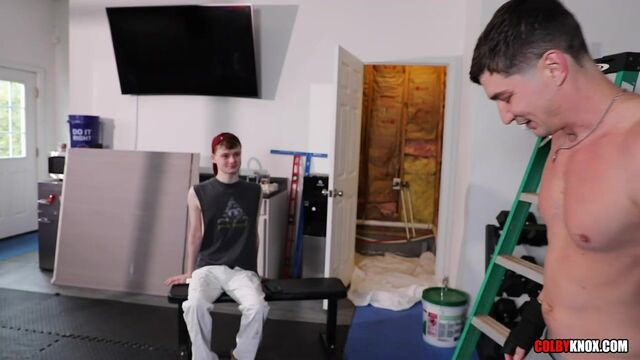 Ethan Adams needs a new boss who understands how a clock works! In this week’s ColbyKnox update, he plays an apprentice, waiting for his foreman to show up. They are supposed to remodel the site’s gym. Colby Chambers has put off his workout but decides he can’t wait any longer. He walks in, introduces himself, and begins lifting weights. Ethan takes a few sly looks at Colby’s chiseled body. “So? What do you do for work,” Ethan wonders. Colby chuckles. “My husband and I actually own a porn site,” he replies. Ethan’s intrigued. “I’ve always kind of thought about wanting to do that but it just seems so complicated,” he notes. “I wouldn’t really know where to start.” “It’s pretty simple,” Colby explains. “Would you, maybe, like to show me,” Ethan shyly asks. Colby gladly takes the “assignment,” sauntering to the bench where Ethan sits. “Give you a crash course on how gay porn works,” Colby remarks. He sits next to Ethan and they kiss. Colby pulls back Ethan’s T-shirt and snacks on a nipple. He then licks an armpit. When Colby stands up, Ethan hits his knees. “Check out this package,” he murmurs, pulling Colby’s shorts down. Ethan consumes Colby’s cock, licking the head and shaft. He swallows to the base. “Fuck, yeah,” Colby declares. “Take it down your throat.” “Tastes so good,” Ethan replies. Colby holds Ethan’s head and tenderly face fucks. “Let’s see how deep you can take it,” Colby states. Ethan gags but doesn’t pull off the meat. “Feel those throat muscles,” Colby comments. “Would it turn you on if your boss walked in?” “This is turning me on too much,” Ethan replies. “I can’t stop.” He stands up, returning to the bench. This time he’s on his hands and knees. “Going to take me right here on this bench,” he wonders. Colby pulls down Ethan’s white shorts and blue underwear. He dives into the tight hole, feasting on it. “Fuck. Your tongue feels so good,” Ethan exclaims. “You’re getting me so wet.” “Perfect fucking hole,” Colby replies. He gives both cheeks sharp slaps. “I love your tongue,” Ethan whimpers. “You’re going to love my dick more,” Colby says. He gets up, placing the tip right at the backdoor. He gradually works the raw meat inside. “Fuck, yeah,” he calls out. “Take it all.” Ethan moves his sweet booty back. “Bounce on that dick,” Colby encourages. “Fuck me, please,” Ethan begs. Colby lets him take charge so he can get used to his dick’s girth. “You like my tight pussy,” Ethan wonders. Colby methodically deep dicks. “Give me that little boy hole,” he whispers. “Fuck you silly.” Ethan removes his pants and underwear; he gets on his stomach on the bench. Colby stuffs his johnson back inside. “Fuck me,” Ethan groans. “Please.” He changes positions. This time on his back, legs on Colby’s shoulders. When Colby reinserts his dick, Ethan grabs Colby’s arms and thighs. He lifts Ethan up, suspended midair, and impaled on cock. “Fuck. That feels so good,” Ethan moans. “That tight ass,” Colby whispers. He leads Ethan to a stepladder. He holds on, still in midair. Colby pummels his insides. ”Drill that fucking ass,” Colby states. “Boy, take it.” He carries Ethan back to the bench, where it all started. Ethan is on his back, stroking his meat. “I know you want to come,” Ethan notes. He wants to do the same. In this “who will bust first” race, Ethan wins. His milky load shoots out in multiple spurts. “Fuck. That’s hot,” Colby whispers. He wants to leave something inside the apprentice. Ethan gets all fours. “Please give it to me,” he whispers. “I really want it. Breed my fucking ass.” Colby varnishes Ethan’s insides and hole opening with cum.