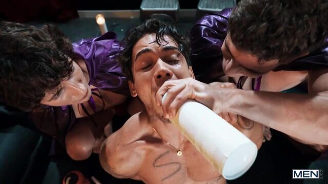 Pledge Ashton Summers is awoken in the middle of the night, then blindfolded and pulled from his bed by robed frat brothers Cristiano and Trevor Brooks. Pledgemaster Trevor tells Ashton he's been chosen to join Summa Cum Load and invites him to take on a challenge, which Ashton is up for, promising to do whatever he's told. After licking up all the whipped cream they squirt in his mouth, he licks Cristiano's hole, then sucks both the guys' cocks. Cristiano fucks Ashton doggystyle, then tags in Trevor to take his turn. The lucky pledge gets to be in the middle of a train, pounding Cristiano as Trevor fucks him, then the frat bros take turns drilling Ashton's hole on the table. Ashton shoots his first official Summa Cum Load before Cristiano and Trevor cum on his chest.