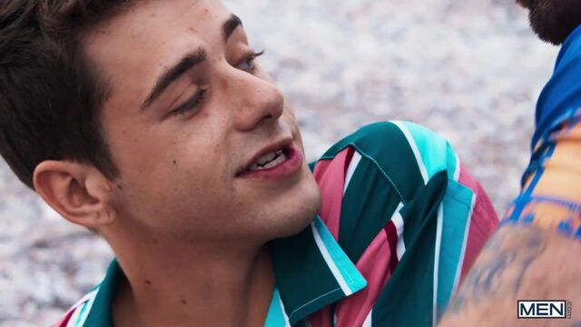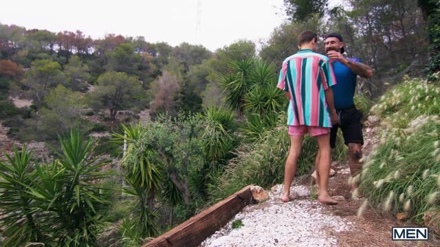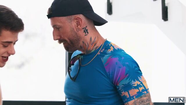Even for Joey Mills, sometimes his fabulous lifestyle is so stressful, he needs to take a step back and make time to relax, so he's headed to Spain to learn to surf. His host, Dean Young, is not just a hot surfer but a hot gay surfer, and Joey's happy to meet him and his boyfriend before going to hit the beach where he meets tattooed Troy Daniels. Troy gives him some tips for riding a wave, but Joey wants to ride him! They find a secluded spot on a hillside where Joey sucks the top, then he sneaks him back to the house while Dean and his BF are grilling. Troy fingers Joey's hole and fucks him doggystyle, and the guys don't even notice Dean sneaking inside to watch them. Joey rides the top till he cums, then Troy shoots on the twink's face.
