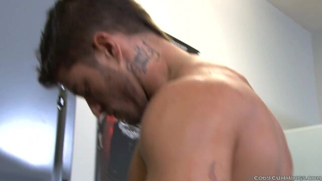There's a hole in the wall, where the men can see it all. And if Cody Cummings finds you lurking behind that hole, your gonna get a dick in your mouth. Just ask Wolfie Blue. Wolfie is hanging out in the restroom stall, peeking out the gloryhole when Cody walks in from his workout. When Cody discovers his spying admirer, he decides to stuff Wolfie's hole with his creamy filling. Enjoy!