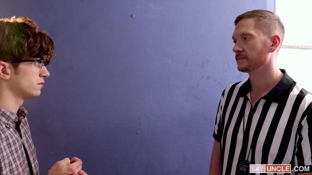 Donovin has been bullied by his classmate Jack for a while now and doesn’t know what else to do about it. Seeking revenge, he steals his backpack and throws everything in one of the school’s toilets. Unfortunately, Coach Kayman catches him red-handed and scolds him. Mr. Kayman is actually concerned about Donovin’s future and doesn’t want his perfect grades to go to waste for these kinds of mistakes. After a warm talk, the coach and the student hug, with Donovin feeling something big and hard in Mr. Kayman’s crotch. The boy wants to leave, but Mr. Kayman tells him he needs to ensure he learned his lesson. The coach suddenly drops his pants, revealing his gigantic cock to his curious student. Donovin feels unsure of what to do and starts sucking his coach’s dick out of fear. Soon, he realizes how much he enjoys having Mr. Kayman’s huge man meat in his mouth, savoring every inch of it. Eager to experience it fully, he lets Brody put his big cock inside his ass, pushing harder and harder with each stroke. The nerdy boy tries to hold his moan as he gets his asshole stuffed by his coach, swearing secrecy about it in the hopes of getting fucked again next time.
