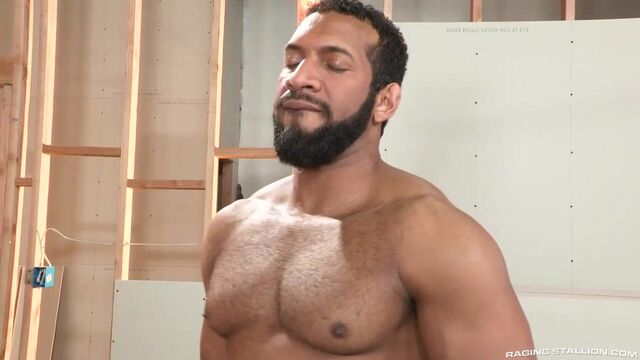 Derek Bolt is giving Jay Landford a tour of his new home that's still under construction. When Derek mentions that Jay will be able to 'fit all his junk' in the master closet, Jay gets distracted and can only think of Derek's big ass. Derek is open to Jay's advances and soon both studs are getting undressed in the middle of the construction zone. Derek is the first to cave to his desires and drops down to suck on Jay's monster uncut cock. Derek can't get enough of the thick meat and would be content to suck it all day long if his ass didn't need a raw dick so bad. Derek urgently bends over the work bench and arches his back to give Jay full access to his hole. Jay slips his bare dick in and pounds hard as Derek moans out with each thrust from Jay's swollen cock. The studs switch it up a few times before settling back on Jay mounting up from behind one last time. With a few final thrusts of his giant dick, Jay cums all over Derek's bubble butt and shoves the jizz inside to continue fucking the construction worker all the way to the end. With his ass full of cum, Derek is ready to blow and turns around to shoot his load all over the floor.