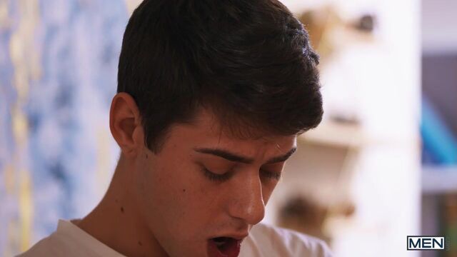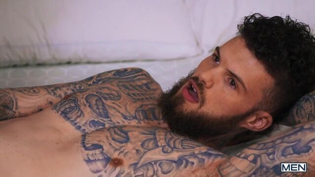 When his roommate is away, Hatler Gurius gets to treat himself to some serious gooning time. He strips down and shuts himself in his room, settling in to jack it to some porn. Joey Mills gets home early and peeks in, only to see something shocking: his roommate sliding his long cock into his own hole! Joey watches, stroking himself, as his roommate self-fucks, but Hatler sees him and pushes him up against the wall! Hatler decides he wants Joey's cock inside him, and Joey fucks Hatler doggystyle. The bottom even DPs himself, sliding his dick inside his hole while Joey fucks him! Joey pounds Hatler in piledriver, then the tattooed gooner rides that big cock. Hatler cums as his roommate fucks him on his back, then gets on the floor for a facial.