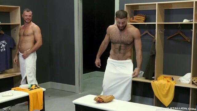 - Description: Bat boy, Sharok, is cleaning up the locker room when players Ricky Larkin and Wade Wolfgar enter from the showers after losing a game. They pick on Sharok for being their bat boy but Sharok knows that they really need to blow off some steam after their loss. Sharok gets on his knees and opens his mouth wide for Ricky and Wade to take turns fucking his eager face. Sharok gets the guys rock hard and bends over to let them get a taste of his hairy hole. Wade is the first to suck on Sharok's hairy crack and gets him nice and opened up for his buddy, Ricky, to fill up with his big raw bat. Ricky slides inside and pounds away as Wade fills Sharok's face with his thick cock. Wade wants his bareback turn now inside Sharok's dugout and takes up the rear with his fat bat. It's almost too big to fit in Sharok's hole but Sharok is determined to take it balls deep and rolls onto his back with his legs in the air. Wade stretches the hole in front of him as Ricky fucks Sharok's face. The guys take turns railing both of Sharok's holes from each end until Wade wants his turn as the catcher. As a last-minute pinch-hitter, Wade goes from pitcher to catcher and lies back to let Ricky pound his ass. Ricky plunges Wade's open hole until he pulls out and sprays Wade's hairy balls with thick jizz. Next up, Sharok steps off deck and up to the plate to fuck Wade until both spent studs blast all over Wade's furry body.