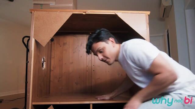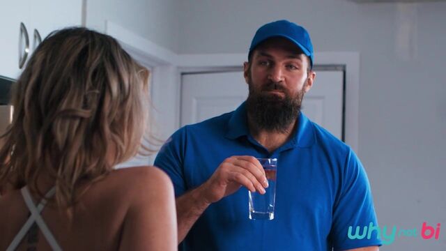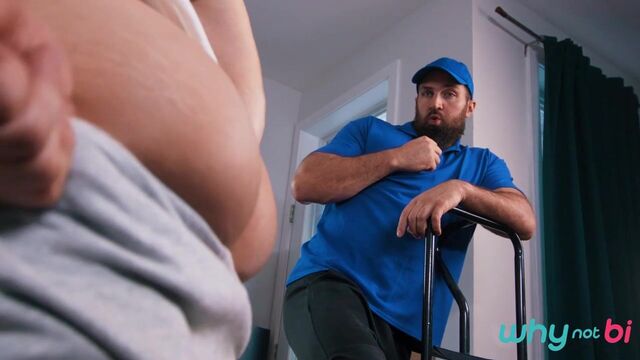Enzo Muller has another job for Moving Chuck, but there's just one problem: his girlfriend, Nikki Hunter, keeps trying to steal him away! Enzo hides in the furniture he wants Chuck to move, reaching through a secret gloryhole to suck him, but when Nikki catches him, she drags her BF out and takes his place. The couple's bickering is loud enough to get Chuck's attention, but he's got a simple solution: fuck both of them. He carries them both to the bedroom and hoists Nikki for an upside-down blowjob, then Nikki and Enzo both suck his big cock. Chuck and Enzo spit-roast the blonde, then Nikki sucks Enzo while Chuck penetrates him. They form a train, then Enzo rides the top as Nikki sucks him. She rubs her clit till the couple cum together, then Chuck shoots on their faces.