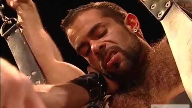 Iron-clad top stud Vinnie D'Angelo cracks the whip, breaking the strong-willed Steve Cruz with the help of big-dicked stud Matt Cole. Cruz hangs from the ceiling in a customized swing, allowing his hard cock and hairy hole to be easily played with. D'Angelo takes a riding crop and whips Cruz while Cole eats his ass. D'Angelo puts Cruz to the test, making him beg for Cole's monster meat. Cole eagerly obeys, shoving his cock up Cruz's ass and pulling him back and forth in the swing. Watching the two men proves to be too much for D'Angelo who shoves his own fat cock deep inside Cruz. D'Angelo treats Cruz like a weight training bag, each thrust of his cock like a punch to his hungry hole. Now released from the swing, Cruz devours D'Angelo's cock like crazy. Cole returns to fuck Cruz again then rolls over and offers his ass to D'Angelo. Finally Cole and Cruz shoot their loads all over D'Angelo's boots who showers his own load on them both.