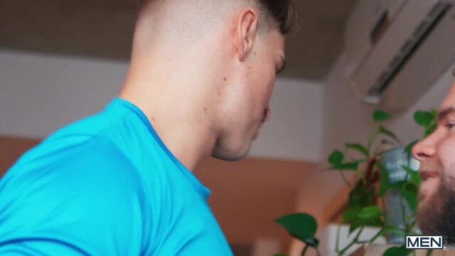 Marcus McNeil skips out on the gym with his roommate to host a hookup with Felix Trainor instead, getting his cock sucked before Felix fucks him. When Malik Delgaty gets home early, he's surprised by how much the two guys look and dress alike! He mistakes Felix for Marcus as he's bent over the fridge and fucks him doggystyle, then tells both guys to join in for a threesome. Marcus and Felix take turns getting spit-roasted till they cum, then it's Malik's turn to shoot while the lookalikes share his load.