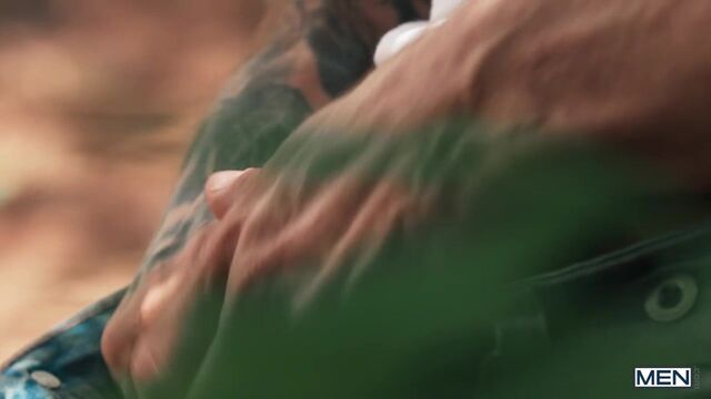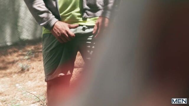 Scott Carter spies Justin Jett working out at the park and comes up to the fence for a closer look, letting the bearded hunk catch a glimpse of him before he fades back into the trees. It's Justin's turn to follow and watch Scott as he touches himself and the guys eye each other. They pull out their cocks and frot, and Justin sucks Scott and licks his armpit before Scott fingers the bottom and rims his hole. The top fucks Justin doggystyle, then he rides him on the ground before both guys stroke themselves till they cum.