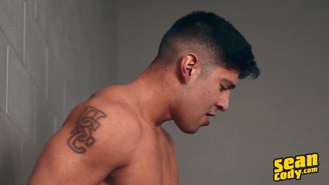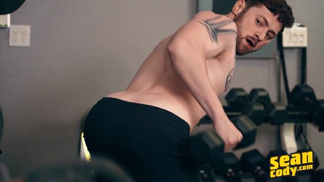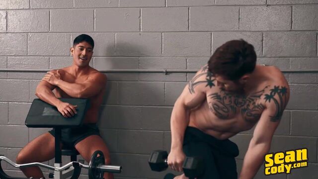 Clean-cut Paco and bearded Lane eye each other in the gym as they do their reps, taking off their shirts. Paco makes the approach after Lane pulls down his shorts, eating the bottom's ass and fucking him doggystyle. The twinks are joined by shaven-headed hunk Rocky, and he and Paco spit-roast Lane before the three horny guys form a train! Paco gets sucked while getting fucked, and then it's time for Lane to get pounded again till he cums before he takes Rocky's hot load on his chest and gets bred by Paco.