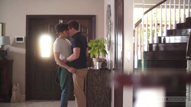 Blake Mitchell is out shopping when he sees the hottest piece of ass in the mall, Angel Rivera. He follows the bouncy booty to a clothing store where the guys chat and Blake invites Angel to the foodcourt for lunch where they get to know each other better. From then on their connection is clear through handholding and a playful romp right out of the mall to Mr. Mitchell's place. Clothes cum flying off as soon as the door closes so the two new love birds can finally get frisky! The heat is on and the make out session is hot and Angel can't wait to get Blake's bulging boner in his mouth.He drops to his knees and pulls at Blake's tight black underwear, releasing his big battering ram and nearly getting slapped in the face with the wild weapon. The lust filled latin gulps and gags on Mitchell's massive member, taking only one moment to catch his breath between big swallows of uncut schlong. Mitchell grabs his guy and steers his hot hiney toward a sweeping staircase. Rivera's rod is pitching a super sized tent in his 'Trophy Boy' undies before Mitchell makes it disappear down his warm throat.Blake's been wanting to get inside that amazing ass of Angel's since the mall and although Rivera asks for a fucking, Blake says he's got one more thing to do first. He spins the trophy muscle twink around, slaps his bubble butt and kisses every inch of the dude's incredible ass while concentrating on the sweet center. Angel asks for more spankings and gets them in spades, along with a tease from Blake's thick thumb.Mr. Mitchell makes Angel say pretty please, then bulldozes his big bareback bone inside the boy's hungry butt. Rivera braces himself against the regal staircase's railing as Blake bangs the fuck out of him. He tries to keep a hand on his love stick but Mitchell is pummeling him to a perfect, porny pulp. So, he uses both hands to brace himself against the banister while getting railed raw and raunchy.Blake takes a seat on the stairs and orders our fantasy fucker to take a seat on his hog. Angel eases his ass back down on Blake's perfect dick while stretching both hands across the grand staircase to get back to grinding groin like a pro. Balancing beautifully, Rivera removes a hand from the railing and works his 'nearly there' wang. He squirts a load of fresh cream onto Mitchell's well muscled six pack.The hot thick liquid oozing down his torso sends Blake over the edge. He jumps up while Angel instinctively opens his mouth a few steps down from Mitchell's monster. Blake blasts the beautiful boy in the face, getting most of his spooge in Angel's pouty mouth. Mitchell grabs the gorgeous goo covered guy and plants a kiss on him, tasting his own hot load in the process.