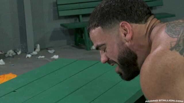 Baseball player Ricky Larkin is trying to buy food at the concession stand from worker, Lucas Leon. When Ricky orders up a 'nice big juicy wiener', Lucas takes the hint and gets on his knees in front of the concession stand to service the star player's big hairy cock. Lucas' mouth gets Ricky revved up and soon Lucas is naked and bent over a picnic table with Ricky's face planted firmly in his scruffy ass. Ricky eats Lucas until neither stud can take the anticipation any longer. Ricky stands up and slowly slides his big raw dick, deep inside Lucas, stretching his hole to the limits as he picks up the pace and fucks the wiener-slinger harder. Ricky wants maximum, bareback penetration and gets Lucas on the floor to pile-drive the horny hunk. It feels amazing for both guys, but Ricky wants to see the look on Lucas' face as hiss extra-thick dick stretches Lucas out. Ricky gets Lucas onto his back and fucks him hard until he blasts his creamy load all over Lucas' spent ass. Ricky fucks his jizz deep into Lucas' hole and keeps pumping until Lucas lets loose and covers himself with his load.