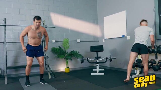 If you need a workout you can do when you're short on time and equipment, today Brysen's in the gym showing off some high-intensity moves, and curly-haired Jackson is watching the stud get sweaty while doing his reps. Jackson gives Brysen a rubdown on the massage table, then takes out the top's cock to suck it. The guys 69, and then Jackson sits on that dick. Brysen puts Jackson on his back to drill his hole, then fucks him from behind till the bottom orgasms, and pulls out to cum on the blond's face.
