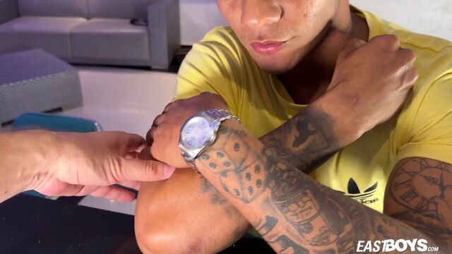 We have yet another athletic dude for you, this time in yellow Tshirt. We took Dani Reynolds to our condo for little R&R. It did not take long before Dani took off his TShirt, and showed of his body. Pants followed and Mr. Jobs decided to wake up Dani's cock. After that Dani mentioned that he never had a handjob by another man. Mr. Jobs replied, that this is his lucky day! And so it went. Fun continued in shower too!