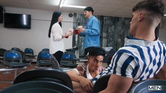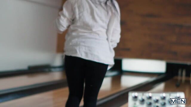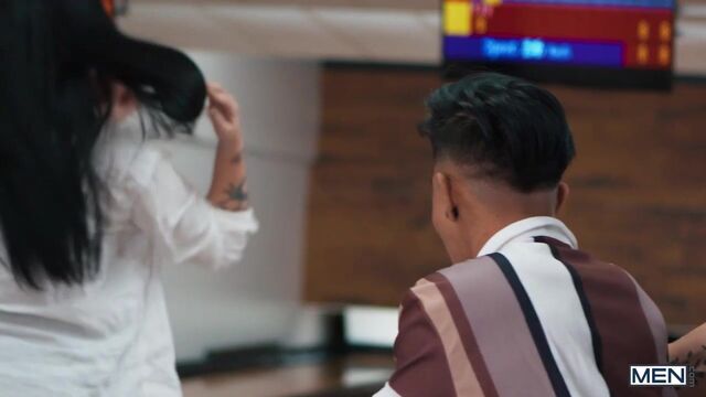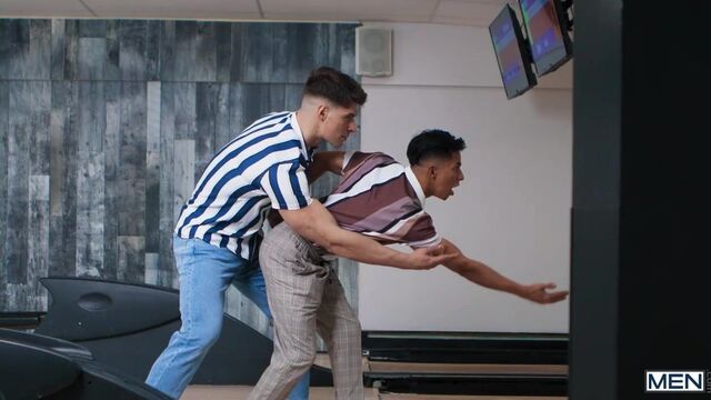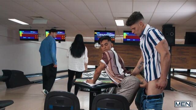 Angel Santana asks his pal's hot BF Malik Delgaty for some pointers on his bowling form, and gets turned on when the hunk's junk grinds against his booty as Malik comes behind to show him how it's done. But Angel gets the wrong kind of split when he bends over and rips his pants! Malik notices the easy-access hole and sneakily fucks Angel, then the bottom sucks him. Malik bends Angel over before the dark-haired twink rides that big cock. Malik drills the bottom at the scoring table till Angel orgasms, then pulls out and shoots cum to spare.