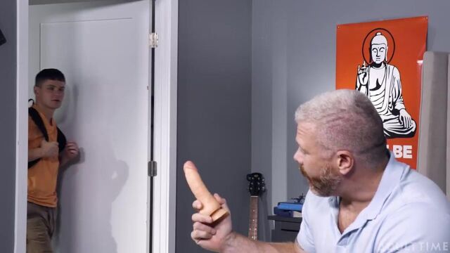 It's not easy having a teen stepson. They eat all the food in the fridge, they track dirt inside the house... But worst of all, they sploosh their jizz all over the place! This is exactly the issue Cain Marko has been running into with his stepson Dylan Hayes. Whether it's goop stuck under the bathroom mat or crusty socks stuffed under the couch, enough is enough! Dylan HAS to learn to control himself.Cain goes into Dylan's room to sort through his stepson's laundry, only to make an additional shocking discovery. Hidden under Dylan's bedsheet is a DILDO. Wow- Cain wasn't expecting this. He decides to wait right there until Dylan comes home so that they can have a man-to-man chat about Dylan's behavior.When Dylan comes home, he's taken aback to see Cain sitting on his bed, holding the dildo he thought he hid so cleverly. Dylan and Cain sit together and have a heart-to-heart. Cain totally understands where Dylan's coming from- after all, he was a horny teenager once as well. But Dylan HAS to make sure to keep his 'activity' inside his room- it's a matter of respect. Dylan totally understands, but he can't help but feel wound up. There aren't any other openly gay boys at his school, so he's having trouble finding a healthy way to release his tension. Cain gets an idea: maybe HE could help his stepson release all that pent-up energy?