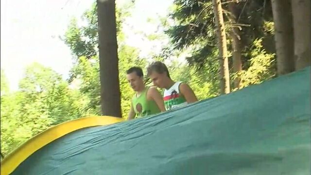 Shane and Joey get hot and horny whilst out camping and they strip each other naked in the blink of an eye before giving some great closeup barebacking action!! This scene gets better and better when baby faced Kevin sneaks in and starts fucking himself with a thick dildo, stretching his boy-hole before getting spotted by the randy duo and brought over to get the taste of the real thing!! They both fill him up and Shane uses Joey's cum as lube when its his turn to pound Kevin before covering his face in jizz.