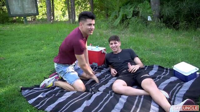 Caetano and Bautista are enjoying a nice picnic in the park. There’s not even a soul on this sunny day, and Bautista’s crotch is starting to go hard. Suddenly, he pulls out his cock and surprises his boyfriend by jerking off publicly. Bautista tells him to be careful, but he also feels the sudden urge of having his boy’s dick for dessert. Soon, the hot Latinos are enjoying a nasty sixty-nine while trying not to get caught. As no one passes by, the guys double down and get naked to pound each other’s assholes. The heat of the moment makes Bautista and Caetano fuck like pigs, ignoring everything around them. They just won’t stop until they are both showered in each other’s cum, even if someone is watching!