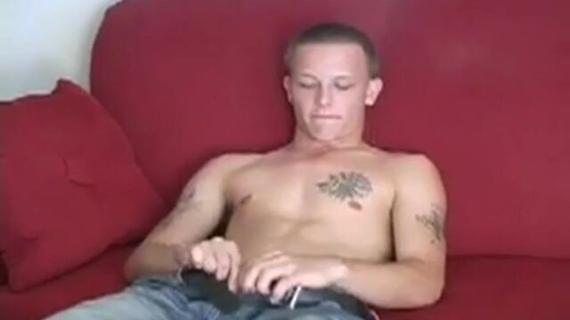 How does a guy remain faithful to his girlfriend but still explore some new ground after being together for 5 years? Getting naked, nasty and beating his meat in front of my camera sure worked for 21 year-old Kirk. This little hottie has the perfect ying-yang of the remainder of an angel faced cherub with the ink, attitude and overflowing balls of a bad boy that can barely be contained. His body is etched and lean and draws your eyes down to the blonde bush with a very hard, pointed, meaty seven incher that seems always ready for another round. That hot body has been kissed by the sun until its lighty golden - in sharp contrast to the Artic white skin under his bathing suit line.That shows off the roundest, perkiest, tightest set of glutes that I have seen for a long time and you get a great view as he rolls over, humps the couch, that hard dick sticking between his legs and that cherry hole winking all the time. He told us he's good to shoot twice a day but saved up a big load for us. Big isn't exactly the word we used...a HUGE load is more like it that left his covered from chin to balls!