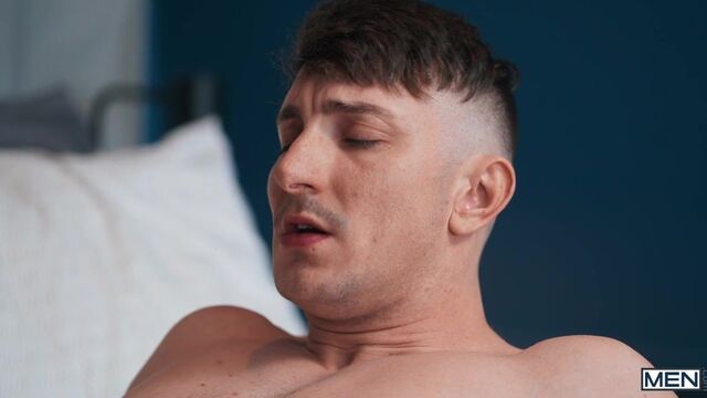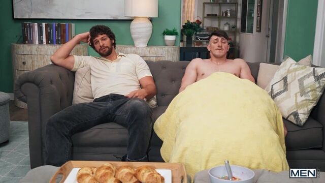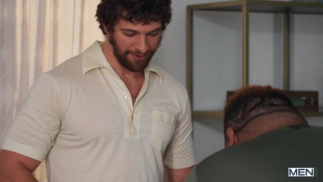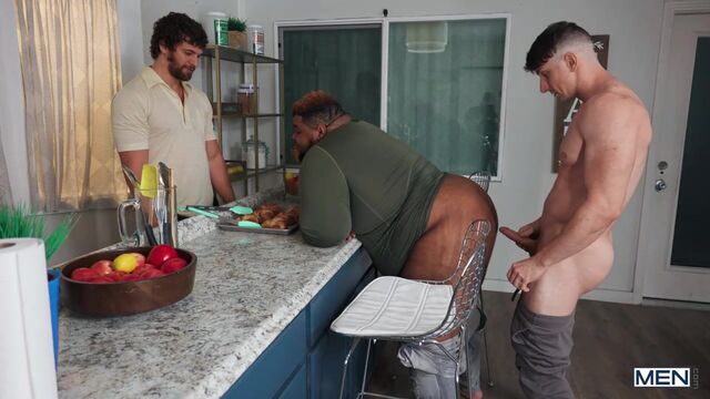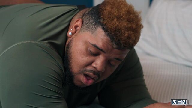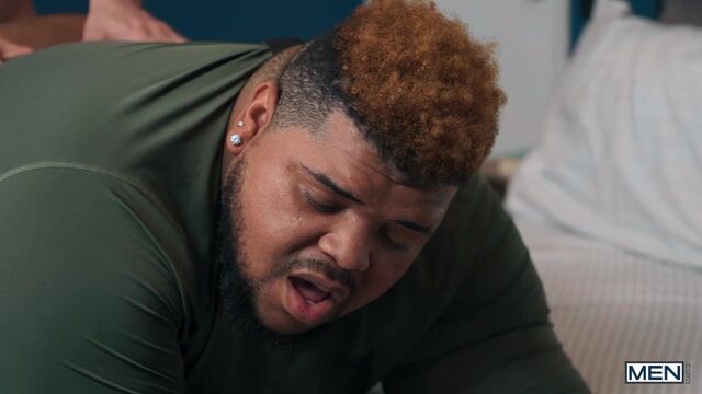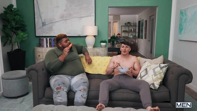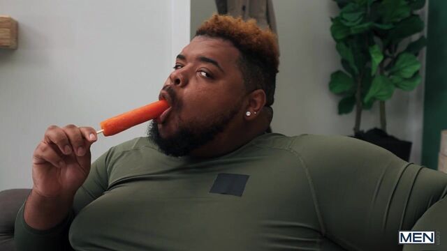 Santana XXL came to visit his buddy's new place, but when he's introduced to his friend's brother-in-law Michael Jackman and spies his semi through his sweats, that's all Santana can think about. The chubby bear sucks an ice pop, giving Michael a preview that has the horny top pull out his cock to get the same treatment. Michael hides the bottom under a blanket, then sneaks to the kitchen to give him the D. After they get discovered, they head to the bedroom where Michael fucks Santana's big ass and his throat, till he cums all over the bottom's face.