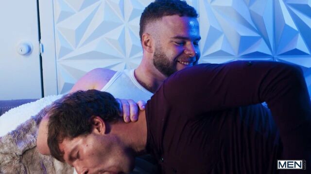 Marcus McNeil and Benjamin Blue kiss and touch each other under lights as blue as Benjamin's moniker, gradually letting their embrace deepen into more as Benjamin takes out Marcus's hard cock and swallows it. Marcus tongues the bottom's hole and slowly penetrates him, making him cum as he fucks Benjamin on his back. The bottom orgasms again as he rides Marcus, and he asks the sexy top to breed his hole.