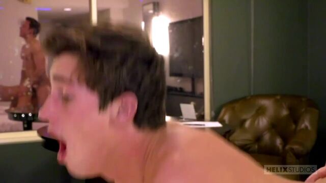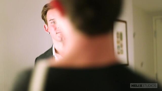 On the road after closing a big deal, business man Josh Brady stops at his hotel, only to hear a knock at the door a few minutes later. It's cute twink, Dallas Preston who stayed in the room the night before, and left his phone. Brady checks out the boys bangin' backside as Dallas digs for his phone. After finding it, and leaving, Josh starts to get undressed, but hears ANOTHER knock at the door. He answers it pantless.