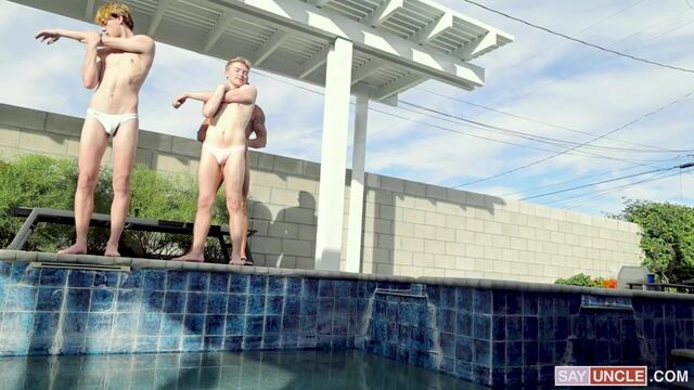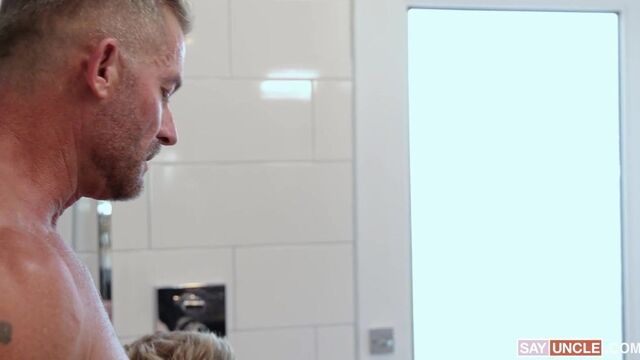 After a long day of training for the swimming competition, Greg and his stepson Zacc hit the showers. They are joined by Skylar, a friend of Zacc's who’s actually a bit shy about sharing the shower with other guys. Greg and Zacc reassure him and help him relax by fooling around with him. Soon, both Zacc and Skylar are sucking Greg’s dick, with both of their mouths savoring every inch of the dilf’s meat at the same time. Out of the blue, Brody, Skylar’s stepdad, walks into the showers. Shocked to see his stepson eating another man’s cock, he demands an explanation. Greg invites him to join them as Zacc reaches out for Brody’s dick. The concerned stepdad’s worries go away as soon as he feels the twink’s mouth gagging on his boner. A horny foursome unfolds as the two stepdads grab the cute twinks’ butts to stuff them in the steamy and wet ambiance.