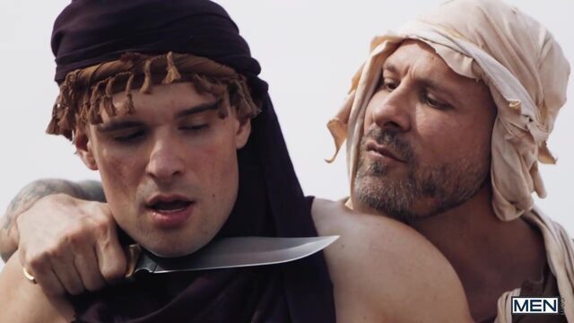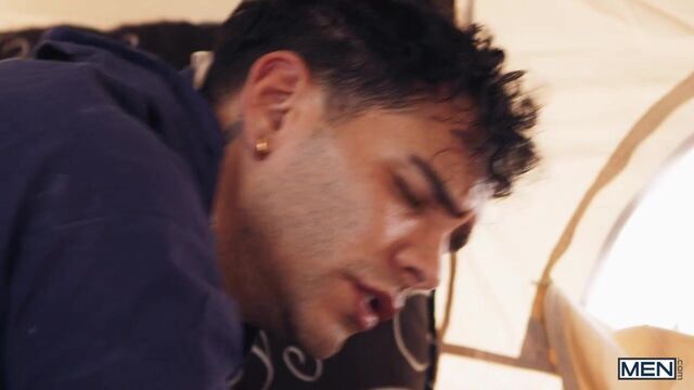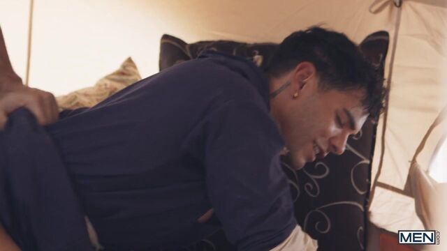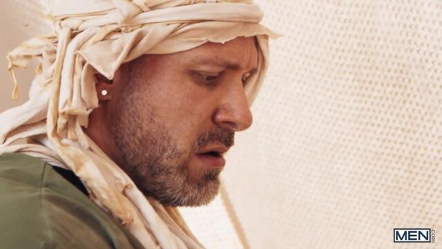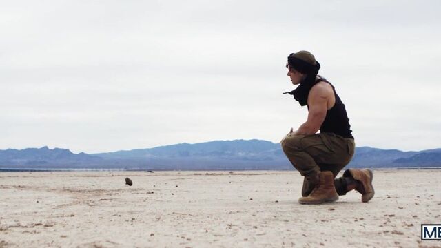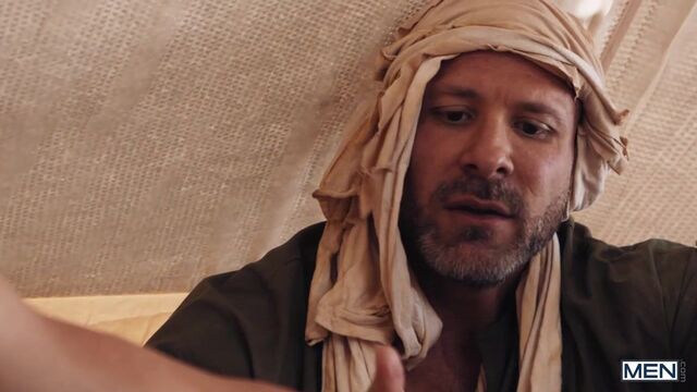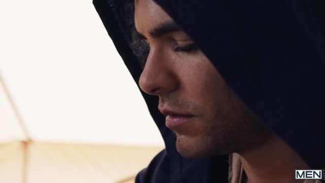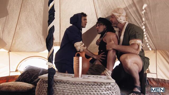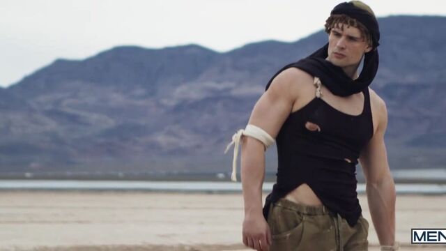 In a post-apocalyptic wasteland, Malik Delgaty wanders the once-verdant desert searching for something more precious than gold: water. After drinking the last dregs from his canteen, he sees a tent and drags himself closer. Inside, Austin Wolf and Damian Night have water, but no food, but Damian wants the precious source of calories in Austin's balls! Malik watches, touching himself, as Damian sucks the top's cock. Austin rims him, then fucks the bottom doggystyle. The secret watcher jacks his dick as he watches the submissive bottom ride the top and get fucked till both orgasm, but as Malik is plotting how he can get his hands on some of their water, he gets a surprise...