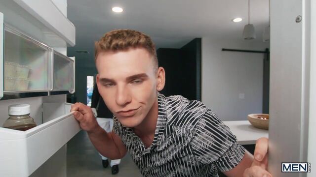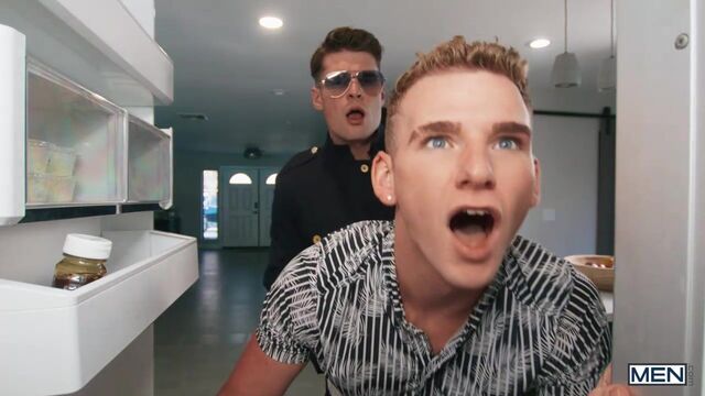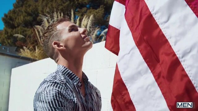 Jack Waters isn't looking forward to the Memorial Day barbecue, until his dad mentions that he hired a real marine to come celebrate. Jack's jaw drops as Malik Delgaty walks in looking hot in his dress uniform, and Jack hurries to raise the flag. Malik salutes, and Jack grinds against him, raising the pole in Malik's pants too. It's tough for the marine to stay impassive when the twink starts sucking him, and he follows him inside to fuck that all-American ass in the kitchen. Malik puts the bottom on the counter to target his prostate, then Jack rides him on the floor. Jack cums as he gets pounded on his back, then gets to his knees to take the hero's load.