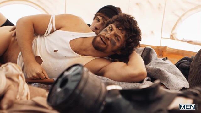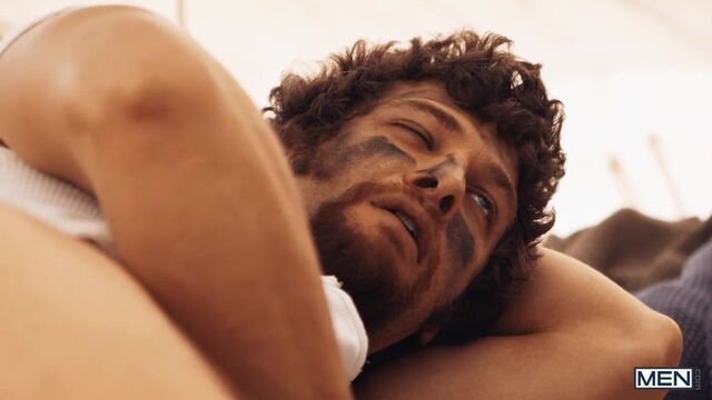 With his canteen filled enough for a few days, Malik Delgaty sets out across the desert alone and on foot, with instructions to run if he sees any of warlord Roman's men. But when he's chased down by two goons on wheels, Malik is cornered and captured! Shamu Azizam and his partner bring Malik back to their tent, and the charismatic wanderer soon talks his way into Shamu's bed... and his hole! He fucks the warrior in spoon, then doggystyle, even drilling him in piledriver. Shamu sucks Malik, then begs for his cock in his hole and cums as he gets fucked on his back. Malik shoots his load on Shamu's face, but will this new ally be permanent or only temporary?