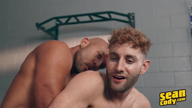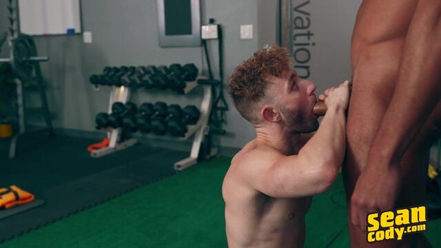 When Jackson sees hot, shaven-headed Rocky in the gym, he strips off his shirt and switches to an exercise that shows his ass to full advantage. Rocky checks out the curly-haired twink and starts getting hard, pulling down his shorts to display that big dick, and Jackson takes the invitation to suck it. Rocky tongues the bottom's hole, then eases inside before demonstrating his strength with a stand-and-carry. Jackson bends over a block to get filled nice and deep, then rides Rocky on the floor until he orgasms before taking a hot facial.
