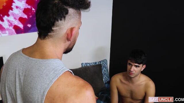 Miguel is obsessed with his stepson Rob’s sex life. The boy has been hanging out with “a friend” lately and wants to know what’s going on. To find out, he hides a camera in his room and watches him talk to his “friend” while jerking off. The whole image of his stepson playing with his image gets Miguel all horned up, so he decides to confront Rob about the situation. Miguel barges into the room as the boy strokes his dick and demands an explanation. Rob finally comes clean about dating his friend, prompting Miguel to thank him for being honest with him. A tender moment unravels as the two men start making out. The horny stepdad realizes his wet dream of touching his stepson’s smooth body. Rob lets his stepdad caress his cock, letting him take control. Miguel spits his stepson’s asshole to get it all wet and lubricated before pounding it as a way to seal this special bonding moment.