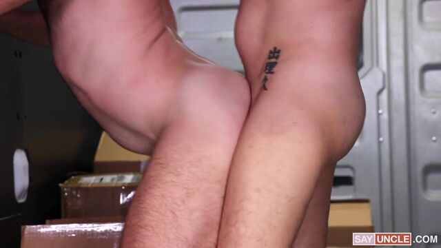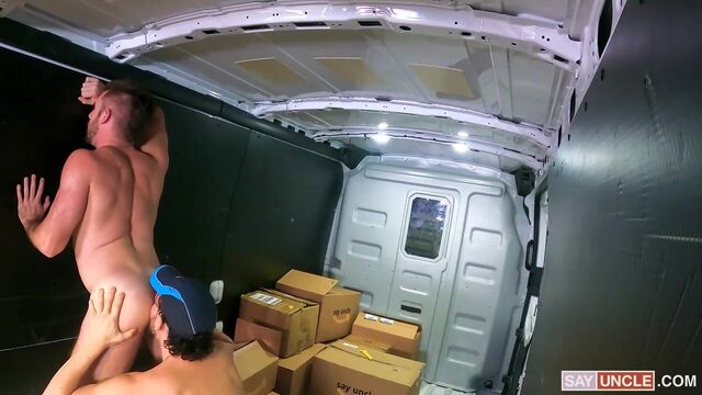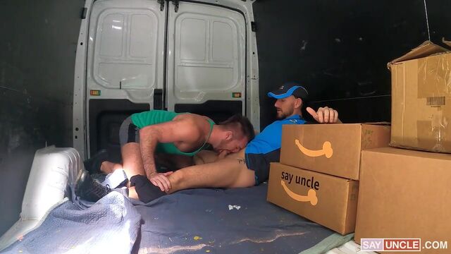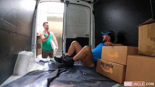 - Description: What’s up, SayUncle fans? We’ve got a fun new experiment for you in this Labs update, so let’s jump right in! This concept is easy to understand. It’s all about horny delivery drivers who would rather get their cock sucked than deliver packages. In fact, the only packages they’re interested in are what the studs they spy on are packing underneath their shorts! In this episode, Derek, a horny delivery driver, catches Jace jerking off. He watches the stud through the window and sends him a dick pic through the delivery app. Jace is caught off guard but is immediately turned on and wants to see if he can still catch the delivery driver in time to play. Jace does catch Derek in time, and the two start messing around in the back of the delivery van. Jace takes Derek’s cock like a champ, riding him and loving every second of getting his hole stretched. The two studs fuck until they both treat each other to a hot creamy load.