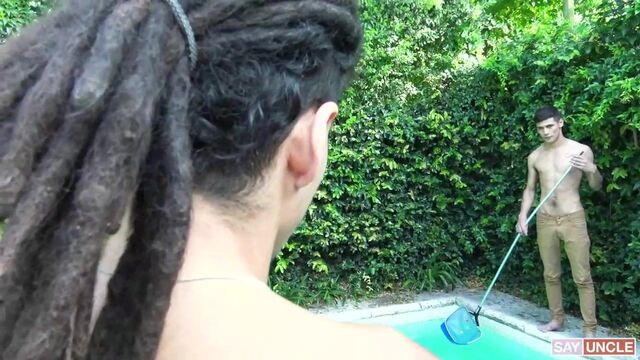 - Description: This green-eyed boy is drop dead gorgeous, and even though I’ve hired him to clean my pool, I need to see what he looks like with a cock deep in his ass. I pay another one of my favorite studs to come over and distract the green-eyed hottie with his muscular body, seducing him as he peels off his clothes piece by piece. The boy can’t help but be a little curious, and soon, he’s got his legs spread for the stud to plow his tight asshole raw. The cutie enjoys some deep barebacking and enjoys a helping of hot leche on his lips.