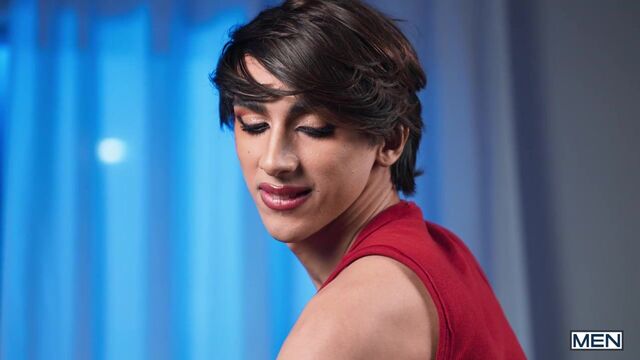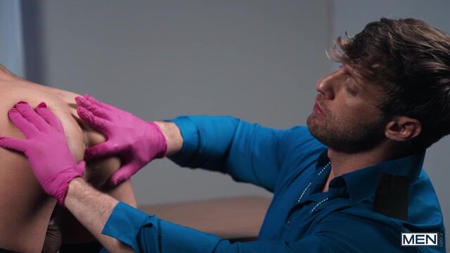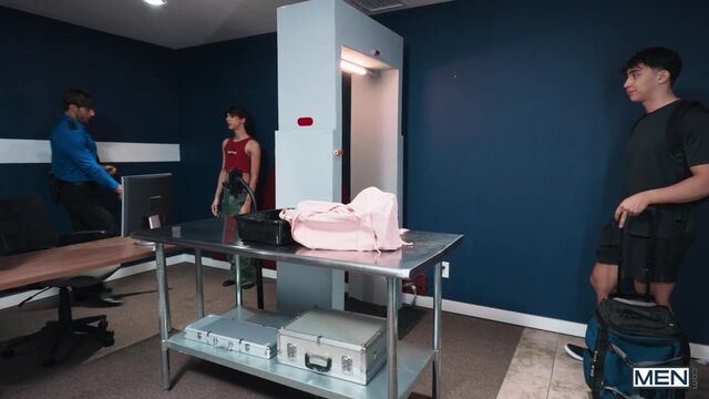 Femboy Foxy Alex keeps setting off the metal detector at airport security. Security agent Dom King does a bag check and wands him before finally finding the cause: Foxy's cock cage! He brings the femboy to a private room for a cavity search, spitting on his hole and sliding his fingers inside. Foxy doesn't have a key to the cage, so Dom picks the lock before Foxy deepthroats him. The agent fucks the femboy doggystyle, then Foxy rides him before Dom hoists him for a stand-and-carry. Foxy cums hard as Dom pounds him on the table, then begs for the top's load on his face.