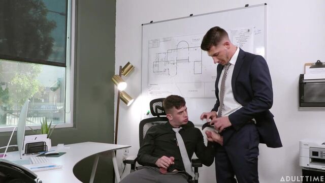 Trevor Brooks is hard at work in the office, though he soon notices that he's the only one around. Seeing an opportunity to steal some 'alone time' to alleviate a bit of stress, he goes for it, pulling his cock out for a little rub.Not long after, his boss, Jordan Starr, happens by and catches him. But instead of calling out Trevor, Jordan stays quiet and watches from afar with appreciation while stroking HIMSELF over his clothes.Finally, unable to just stand idly by any longer, Jordan steps inside and startles Trevor. Trevor is shocked and embarrassed at getting caught, covering himself up as best he can and stammering excuses with nervous, sweaty energy. Fortunately for him, Jordan assures him that he's not mad -- quite the opposite, actually! Jordan LIKED the show, so... how about they pick up where Trevor left off?