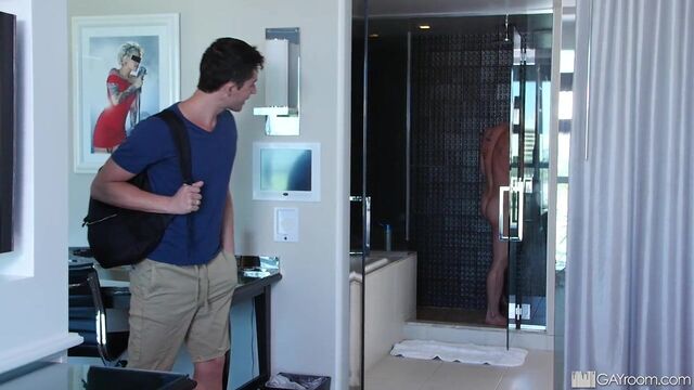 Curious bottom boy accidentally walks in on muscle jock in the shower before sucking his wet dick.