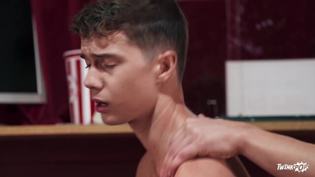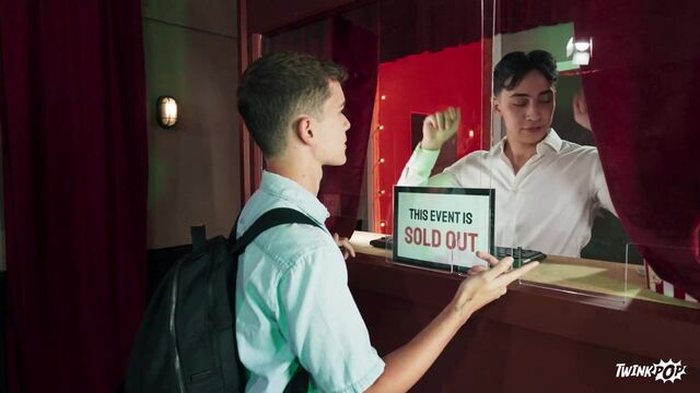 Sam Ledger camped out all night for this special event, but just as he makes it to the ticket window, Cameron Neuton tells him they're sold out. Sam sees a stack of special reserved tickets for staff and family, and promises to do literally anything for one, getting down on his knees, so the booth twink sticks his cock out a hole in the side, and Sam sucks it. Cameron comes out to blow him, then fucks Sam up against the booth. The bottom rides Cameron on the floor, then gets pounded on a bench till the top pulls out and shoots all over him. Sam earned that ticket!