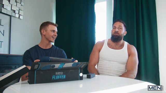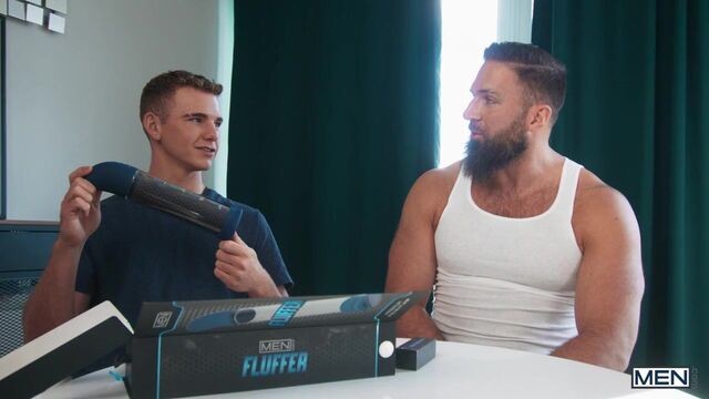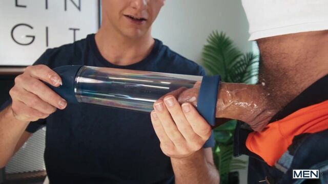 Twink Jack Waters is presenting a very special unboxing video, opening up the Men Sex Gear penis pump, the Fluffer. Jack shows off the included charger and pouch before pulling out the main event, then calls in Chuck Conrad to test the toy out. Even on the first setting, the Fluffer grows Chuck's big dick to a huge size, and Chuck needs to use that boner now! He bends Jack over the table and pounds into him, then the twink rides that monster cock. Jack lies back in the chair to get fucked, then sucks out Chuck's massive load while jacking himself off.