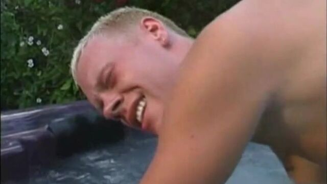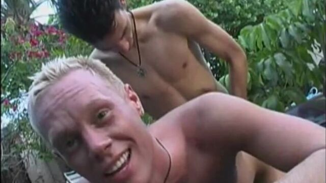 Delicious blonde twink Brandon Baker gives up his smooth ass for his sultry latino friend Gabriel. After trading hot blowjobs, Brandon bends over and begs for Gabriel to fuck him. Gabriel plows his buddy's hot hole for a long time... so long in fact that it got dark and the two fuck-buddies had to finish up in the bedroom. Brandon blows a nice load, followed by Gabriel's mega-large cumshot.