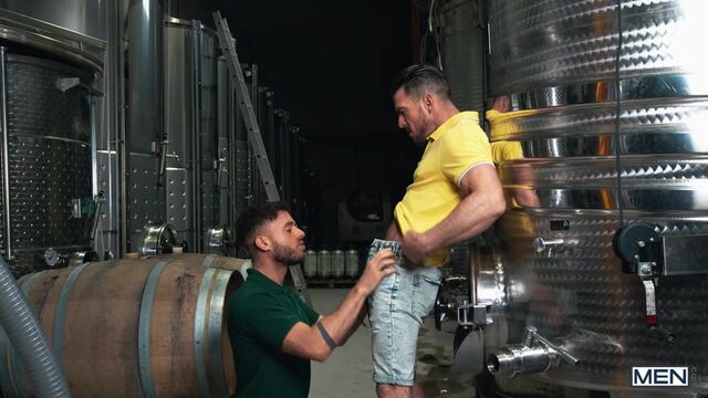Paddy O'Brian was hoping for a little naughty nookie on his romantic vineyard visit with his girlfriend, but she shuts him down. Tour guide Manuel Reyes sees Paddy rubbing his cock and decides to offer him the full package! Manuel locks Paddy's gal in a convenient cellar, then the guys go to town sucking each other. Paddy bends the bottom over a barrel to lick his hole, and they try to stay quiet as he taps that ass! Manuel takes that hard wood in missionary, then rides Paddy on the floor. The vineyard guide sucks hard for a taste of Paddy's cum!