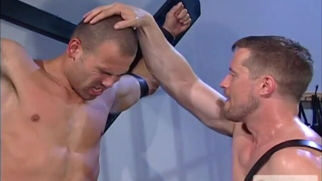 Jason Ridge is latched spread-eagle on an ingenious St. Andrews cross that rotates; his master (Kirk Ziegler) sends Jason spinning as punishment for his defiance. The disoriented stud falls to his knees as he's released. Since he's on the floor, Kirk puts the stud's mouth to good use, face-fucking his slave with his big, uncut cock. Jason's mouth drips with long, silvery threads of spit from the expert cocksucking. Next Kirk positions Jason on all fours and rims his jock-framed butthole. The slave's hole twitches from the sensation of Kirk's rough tongue. Kirk fully lowers his leather pants and shoves his big prick right into Jason's moist hole; he begins to hump with long, slow teasing strokes that slowly give way to Category 5 savageness. Kirk flips the stud on his back and bangs his ass as Jason begs him to fuck the cum out of him. Both men spurt enormous loads and collapse from exhaustion.
