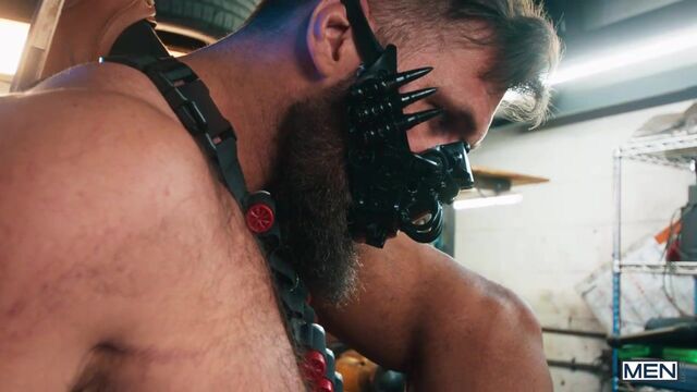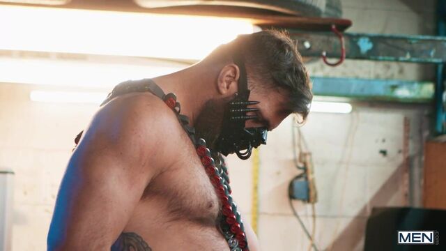 Just a shadow in the night, vigilante top Jawbreaker (Chuck Conrad) sneaks into a garage and gets the drop on the gangster lurking there, freeing bottom Trent King from bondage in the trunk of a car. Trent thanks his rescuer by sucking his cock, and he really wants to take that big dick! Jawbreaker bends the bottom over some tires to pound his hole, then Trent rides the heroic hunk. Jawbreaker drills the bottom till Trent's ready to orgasm, then pulls him up to cum on his dick before shooting on Trent's face.