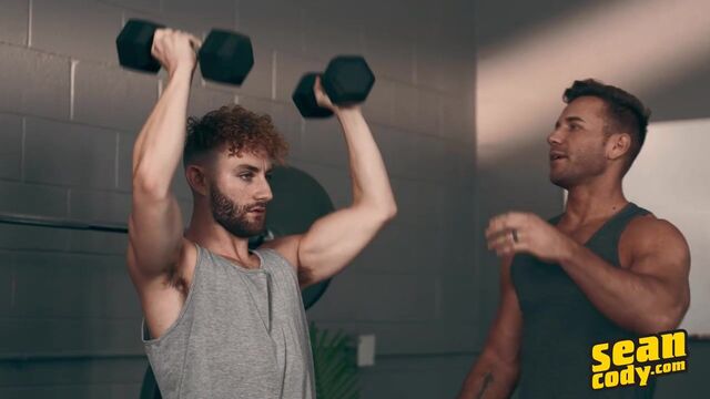 Arch your back, stick your butt out, Sumner reminds curly-haired cutie Jackson as he coaches him in the gym. He makes sure to spot Jackson from behind, where the bottom's ass can graze his junk with every rep! After the workout, the guys strip off their shirts to mop their sweaty chests, and Jackson grinds against Sumner's bulge. The top rims him, then Jackson worships Sumner's pits before taking his big cock from behind. Jackson gets his squats in as he rides that dick on the floor, then cums as the top drills him on a bench, and Sumner covers him with a hot load.